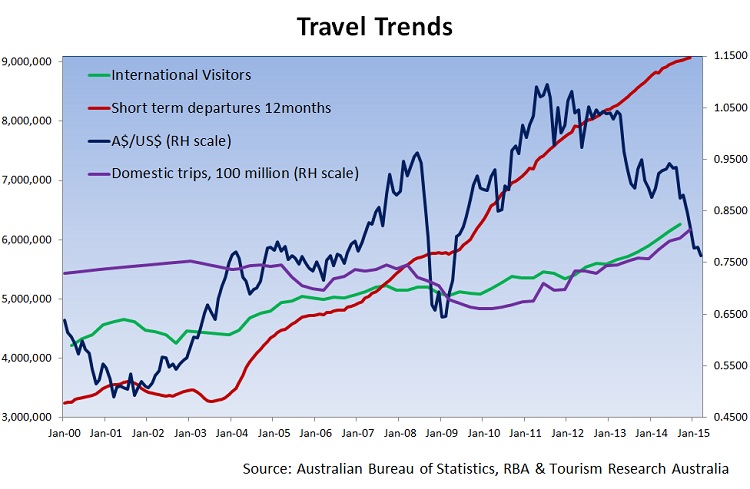 Data released by the ABS today confirms that, while the number of arrivals into the country approached 9 million for the past 12 months and the rate of growth exceeds 8%, Aussies are starting to feel the impact of a weaker A$ and the rate at which foreign travel is growing is slowing quickly.