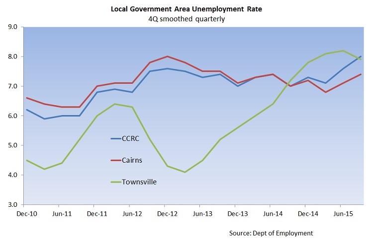 The results for the Sept 2015 quarter for our area show the unemployment rates in both the Cassowary Coast (8.0%) and Cairns (7.4%) having risen slightly from the previous quarter. While in Townsville the data shows a slight decline to 7.9%. As mentioned above, a direct comparison cannot be made with the Conus Trend series for the SA4 regions; but we can consider that over the course of the Sept quarter the average Conus Trend unemployment rate for the Cairns SA4 region (which includes both Cairns City and Cassowary Coast council areas) increased from about 8% to 8.3%; in Townsville the similar quarterly rate fell slightly from 7.8% to 7.5%. So we are seeing some degree of similarity in the two series and a common directional movement.