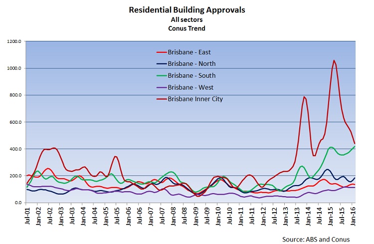 • the dramatic surge in approvals in both Brisbane – South and Inner City (even allowing for the wild swings caused by some big apartment approvals) while the rest of Greater Brisbane sees only modest improvements