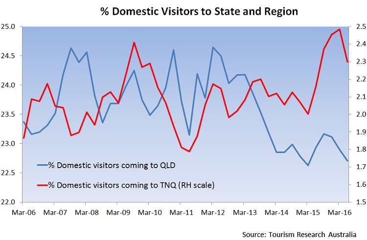 The results were not quite so strong for Queensland where visits were up just 5.7%. As a result the states share of the total domestic market fell to 22.7% which is close to a record low (see the second chart below). However, on the positive side, expenditure in Queensland was up 7% and accounted for 24.8% of all domestic expenditures.