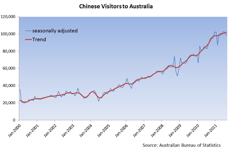 However, as total arrivals grow at an ever faster rate the Chinese market appears to be taking something of a breather. Seasonally adjusted data shows growth of 9.7% from a year ago for August which, whilst still strong, is weakest growth in 6 months and the fourth weakest month in the past 2 years. Considering the less volatile Trend series we see August with growth of 14.2% over last August which is the slowest pace of growth in over 2 years. Growth from China is still robust but it appears to have slowed somewhat in recent months (as the second graph below makes clear).