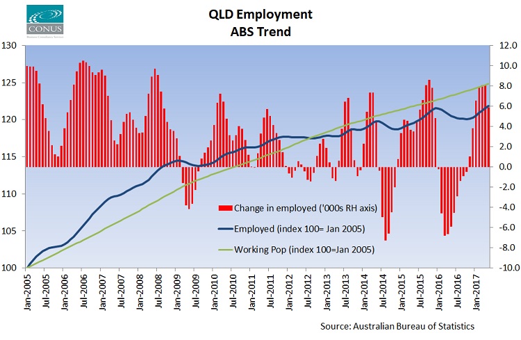 Queensland too saw better numbers although here things are decidedly more muted. Seasonally adjusted jobs were up 5,500 although full-time positions fell by 11,200. The unemployment rate fell to 6.1% (from 6.3% in March) with Participation stable. Again the Trend series paints a more reliable picture; jobs rose by 5,900 (after March was revised slightly stronger) and have been growing at an average pace of 2,600 per month over the past 12 months. Trend full time positions, however, are almost static having risen just 1,800 over the whole 12 month period. The Trend unemployment rate sits at 6.3% (unchanged in 5 months). As the chart below makes clear, although jobs are growing (and the pace has picked up over the past few months) the rate of growth is only just sufficient to keep up with population growth. The Queensland government will certainly be hoping that their “jobs Budget” earlier this week can have the impact on jobs creation it promises.