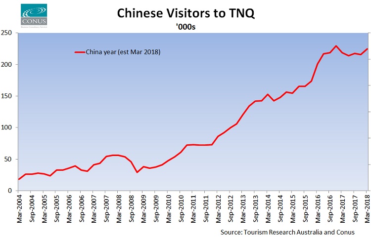 On our current estimation, based upon previous IVS data and the impact of Chinese New Year, if the suggested 13% increase for the Chinese New Year period were to be accurate then that would take Chinese visitors to TNQ for the March 2018 quarter to a similar level to that seen in March 2016 and result in an approximately 3% increase in Chinese visitors for the year to March 2018 over the previous year. The reality is that even allowing for the impact of the lose of charter flights in the March 2017 quarter the results for the June, Sept and Dec 2017 quarters were barely changed from the respective quarters in 2016. The most recent national short term arrivals data suggests that Chinese arrivals for the year to Jan 2018 are running at about 12% annual growth.