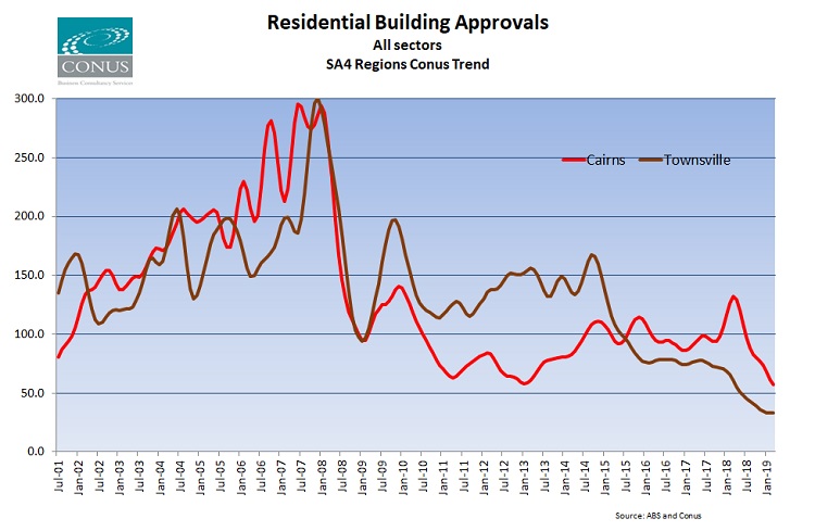The release from the ABS of original residential building approvals data for March allows us to update our own Queensland SA4, and Northern LGA regional Conus Trend series.