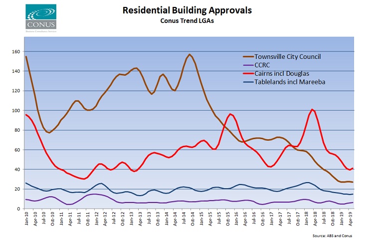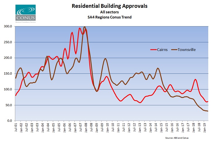 When we consider the Trend data in more detail in our own area we see Cairns SA4 Trend approvals up slightly to 62 (down 48.5% y/y) while Townsville SA4 fell again to a new low of just 31 (down 40.1% y/y).