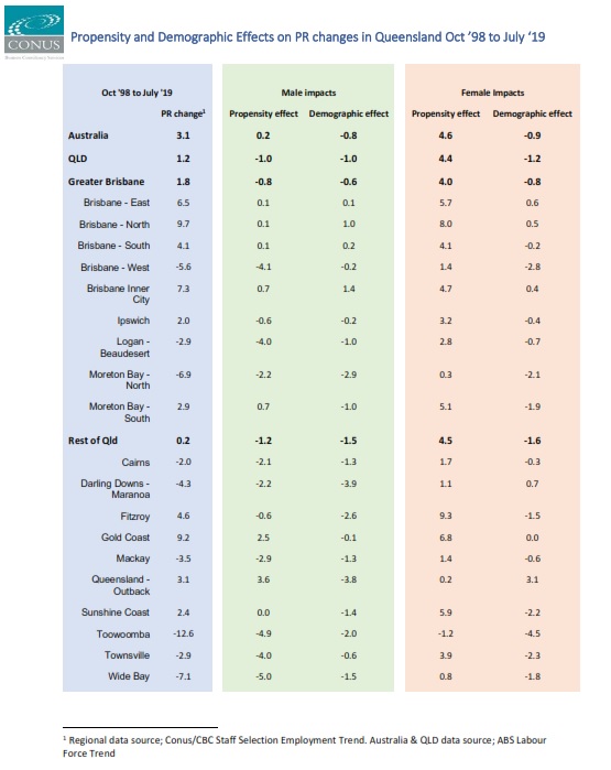 The picture in differing regions varying enormously with some such as Gold Coast seeing sharp increases as propensity effects in both sexes were positive and the population effects were neglible (suggesting Gold Coast is something of a youth magnet). Conversely Toowoomba has seen negative propensity effects in both sexes and strongly negative population effects.
