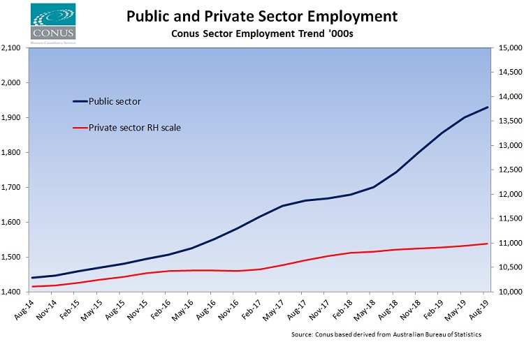 The quarterly ABS quartely detailed Labour Force data provides us with information on employment across both Public and Private sectors in the various industry classifications. Unfortunately this is only provided for the past 5 years, and only in the form of original, unadjusted, data. We have used this data, together with the ABS Trend employment series for calibration, to construct the Conus Sector Employment Trend series. Doing so allows us an insight into how public versus private sectors have been performing over the past 5 years.
