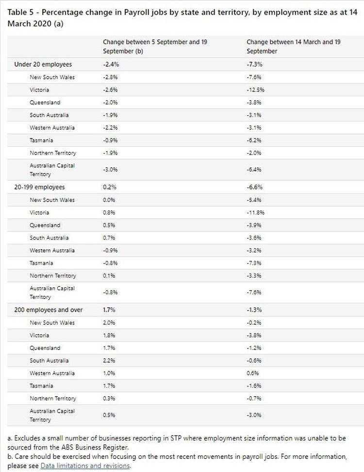 The weekly payrolls data from the ABS up to 19th Sept shows that it’s small businesses (fewer than 20 employees) which are suffering the highest job losses; a situation only likely to have been further exacerbated as the JobKeeper stimulus began to wind-back from the end of Sept.