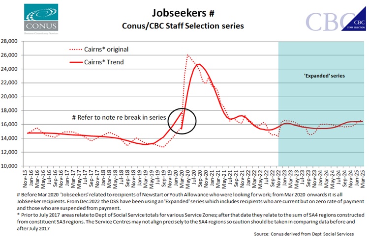 A similar, although less dramatic, story is playing out in Queensland where Trend JobSeekers are up 8.6% y/y and in Cairns where the increase is just 6.7%. It would seem inevitable that these higher number of people receiving JobSeeker payments will be reflected in the unemployment rate in coming months. The RBA and Treasury are expecting the unemployment rate to move higher towards 4.25% by the middle of the year and these JobSeeker numbers would suggest that expectation is realistic.