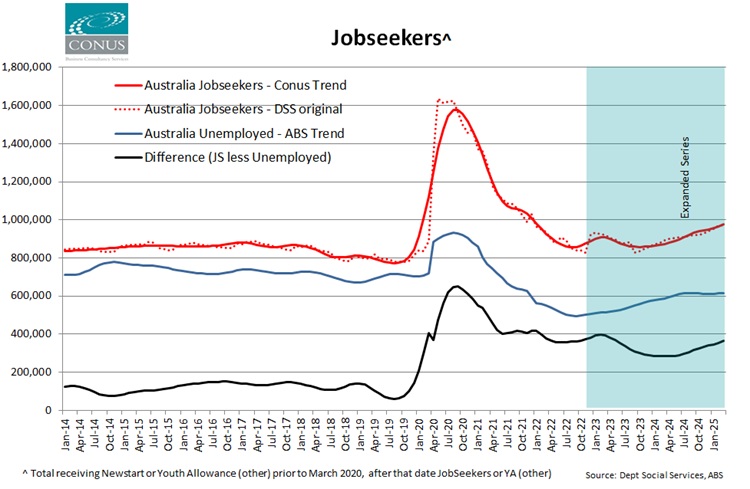 While the Trend unemployment rate in Australia remains remarkably stable (stuck between 4.0% and 4.1% for more than a year), we are seeing some clear signs of the gradual easing in the labour market coming from the JobSeeker data.