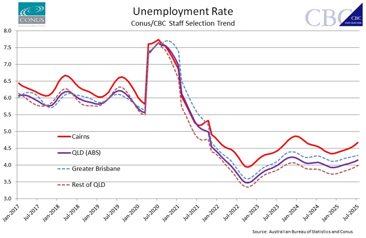 The July Conus/CBC Staff Selection Trend unemployment rate has edged higher to 4.7% after June was revised up to 4.6% and remains higher than the State (4.1%) and National (4.2%) levels. As we see an easing trend slowly playing out at the State and National level we should not be surprised to see the Cairns unemployment rate moving somewhat higher, particularly as participation remains at near-15-year highs.